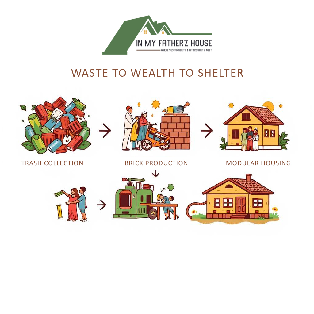 At In My Fatherz House, we transform recyclable trash into opportunity. Our model begins with plastic waste collection, which is then processed into durable eco-bricks. These bricks become the foundation for modular homes built to shelter the homeless. Simultaneously, polyester waste is repurposed into clothing for underserved communities. It’s a circular system that turns trash into treasure—restoring dignity through housing, employment, and hope.